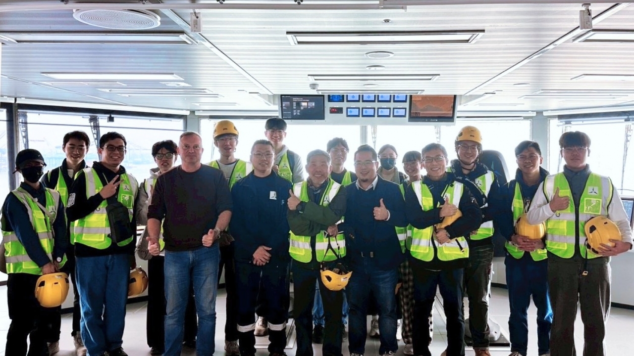 近日於環海翡翠輪泊靠高雄港期間,台船環海很榮幸接待國立中山大學海洋科學學院海下科技研究所師生登船參訪。此次參訪讓學生們首次近距離接觸、並親身登上被譽為「海上女王」的環海翡翠輪,深入了解主力海事工程船舶的運作模式、關鍵技術應用,以及離岸風電專案如何在海上執行風場運輸與安裝任務。